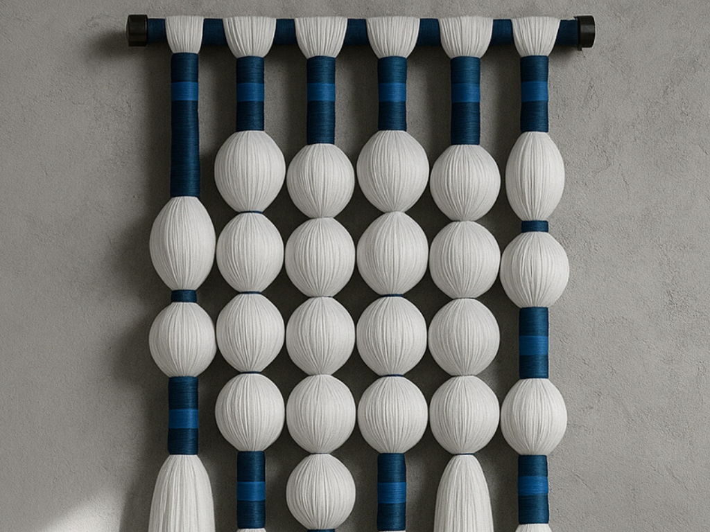 Meticulously crafted using traditional knotting techniques, this handmade fiber wall hanging celebrates the beauty of form and movement. Its design reflects a curated balance of tones, textures, and rhythm that brings warmth and artistic expression to your space.